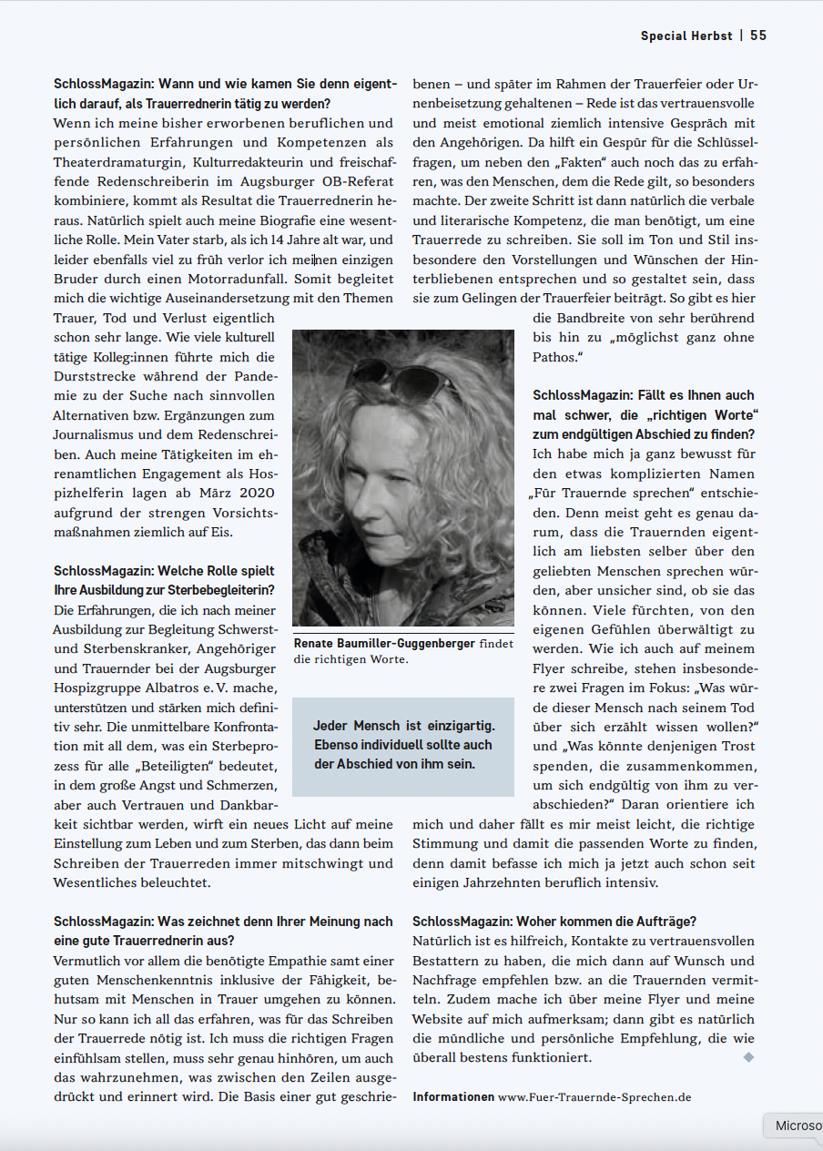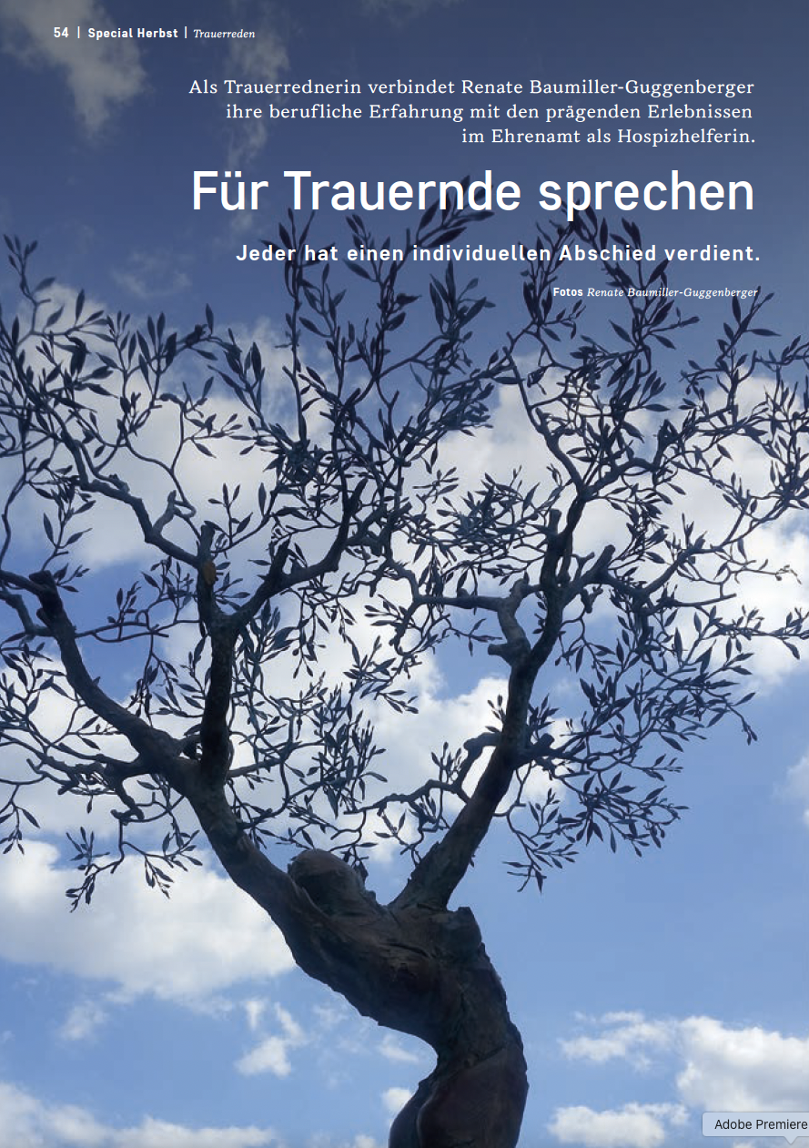 Als Trauerrednerin für Menschen in Augsburg / Schwaben verbinde ich die Erfahrungen und Begegnungen im Rahmen des Ehrenamts als Hospizhelferin – Ausbildung bei der Hospizgruppe ALBATROS e.V. in Augsburg – mit meinem beruflichen Background als Dramaturgin am Theater Augsburg, als Kulturredakteurin sowie Redenschreiberin im Augsburger OB-Referat.